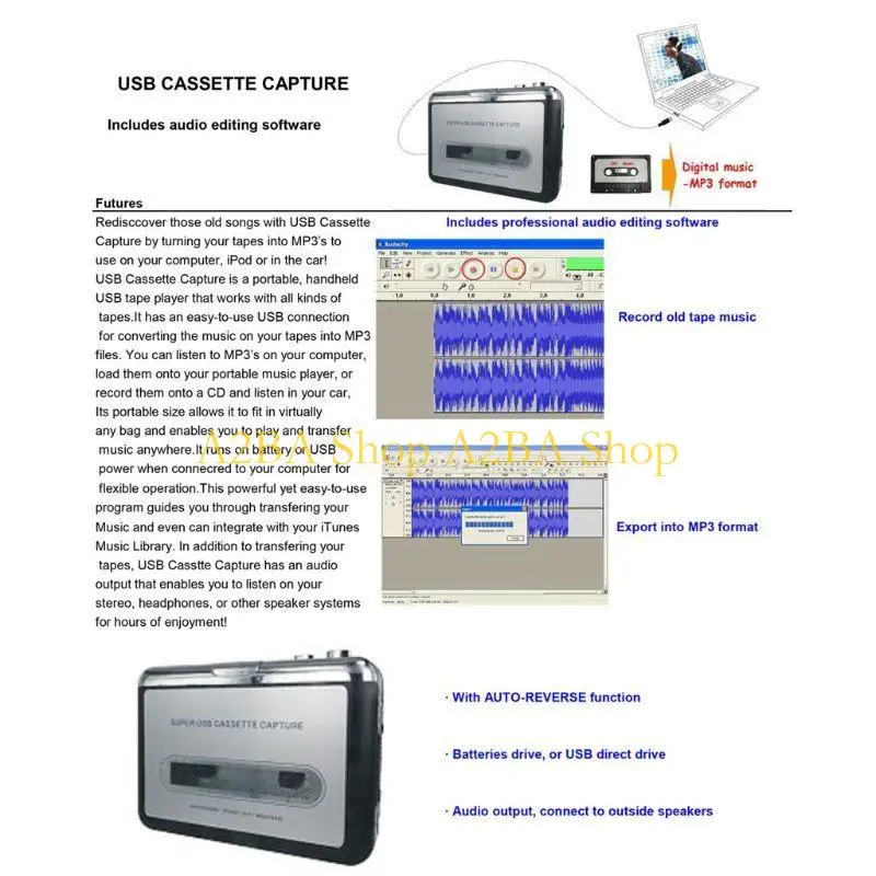 Lettore cassette A2BA Registra nastro convertitore digitale MP3 Acquisizione cassette USB
