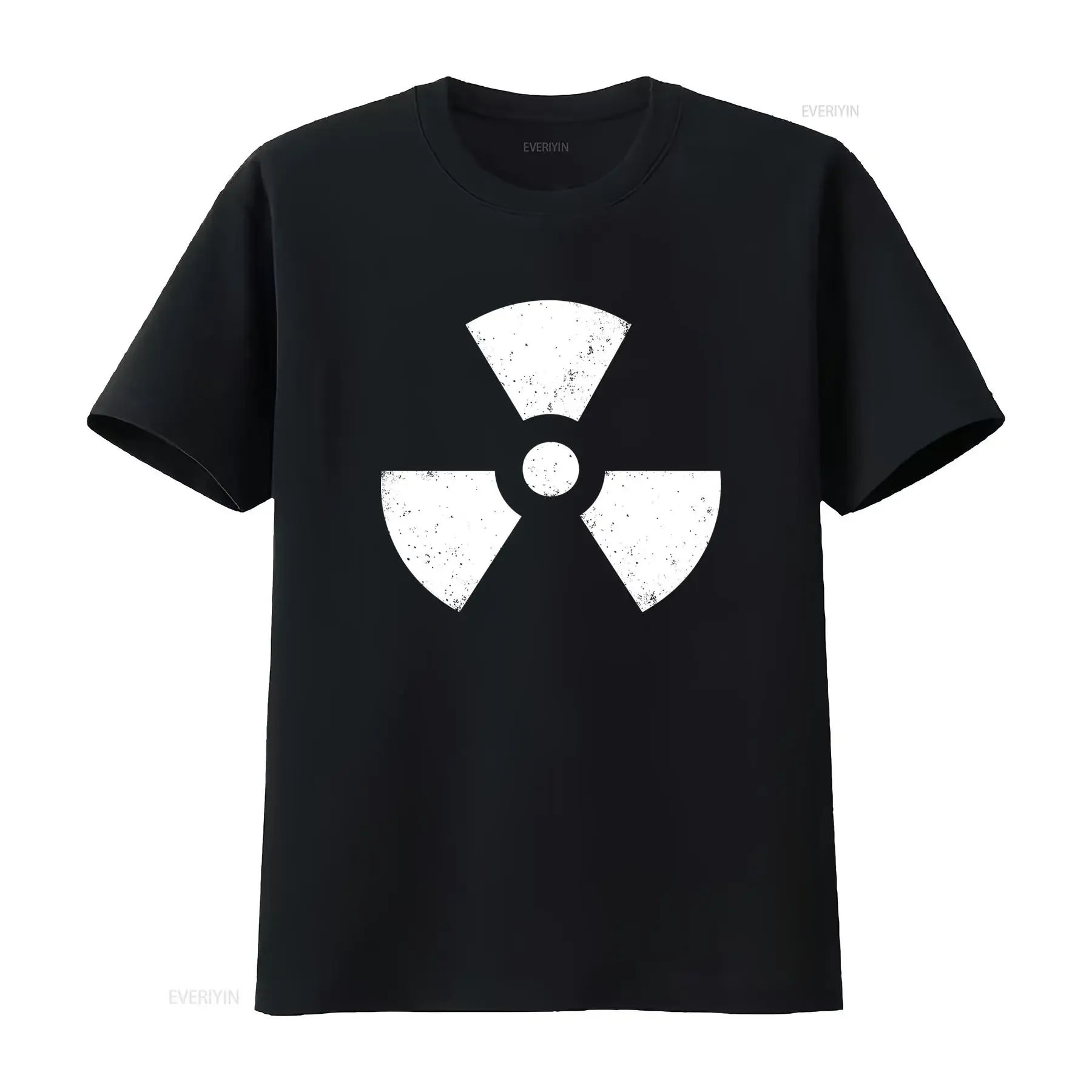 T-shirt vintage con simbolo radioattivo, design a logo con grande simbolo di radiazione, effetto lavato, grafica versatile, morbida