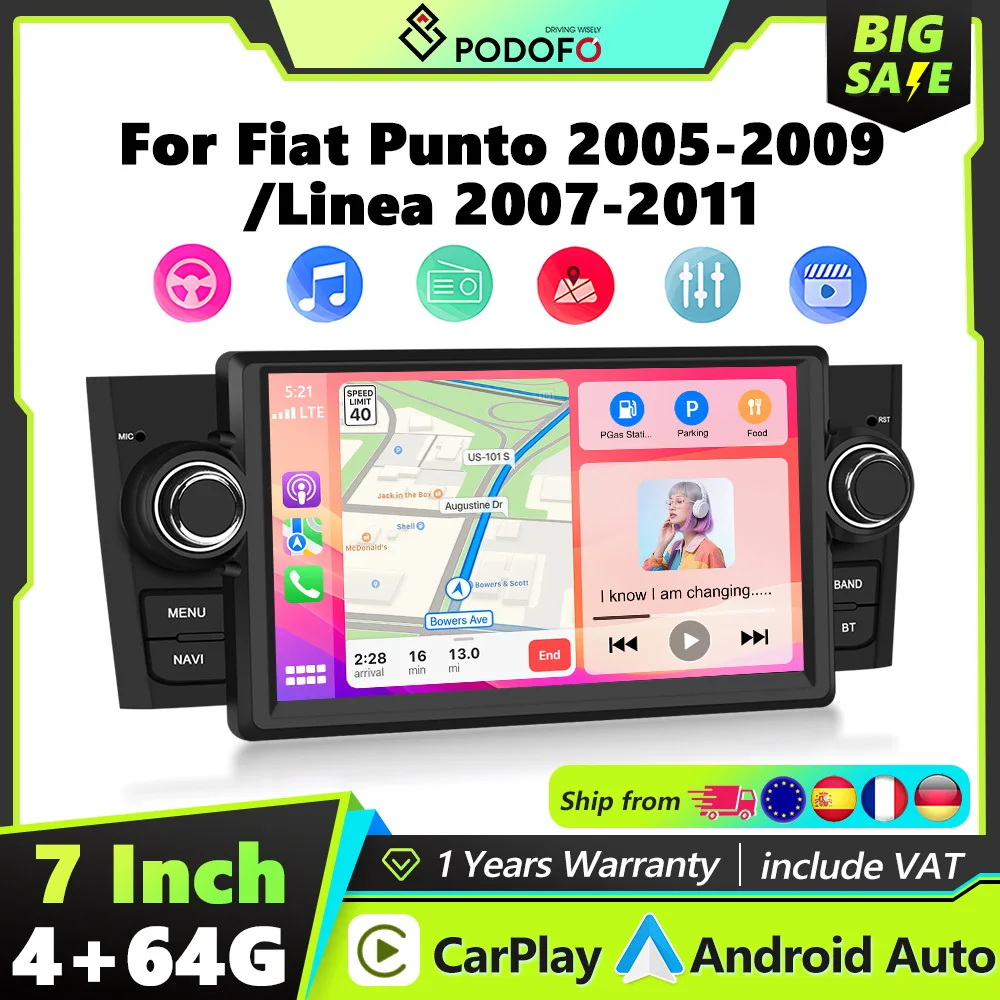 Autoradio Podofo 1Din Android 4+64G per FIAT Punto 05-09/Linea 07-11 con Carplay, Android Auto, GPS, WIFI, Mirror Link e Stereo.