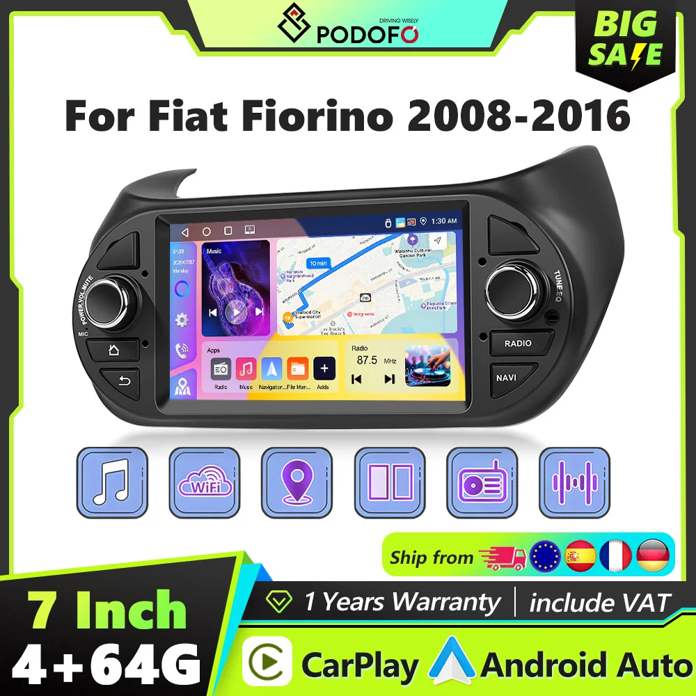 Podofo 2DIN 4+64G Lettore Multimediale per Auto con Carplay, Android Auto, GPS, WIFI, FM, BT, Mirror Link, Audio per Auto per FIAT Fiorino 2008-2016