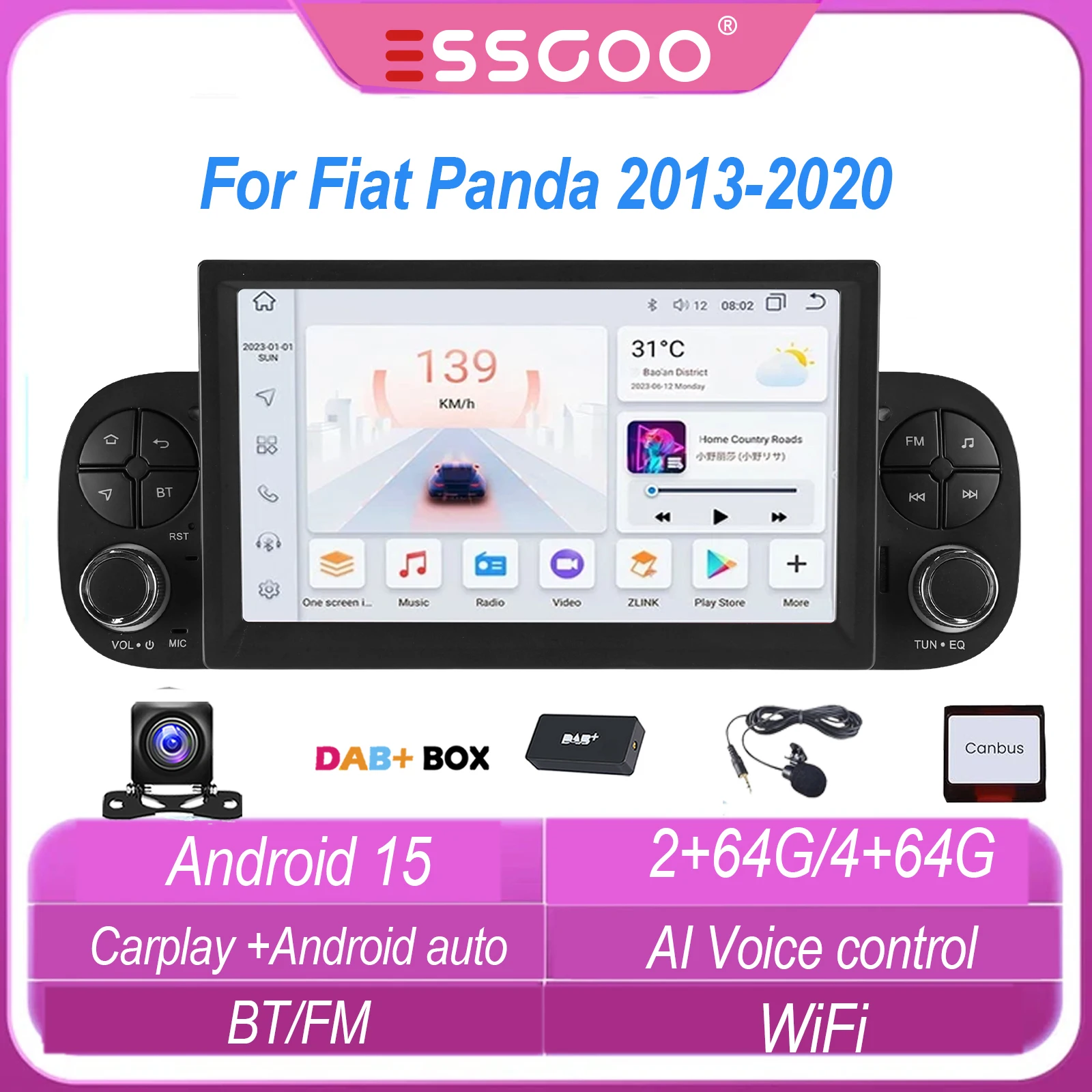 ESSGOO Controllo Vocale IA Android 15 Carplay Wireless 7 Pollici Display Touch IPS Per FIAT PANDA 2013-2020 Autoradio Lettore Multimediale GPS Navi= WIFI Mirror Link Bluetooth Controlli Volante FM Schermo Divisibile