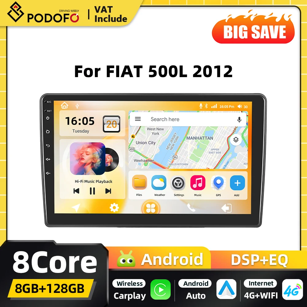 Autoradio Android 2DIN Podofo con Snapdragon 8Core e Carplay per FIAT 500L 2012, Navigazione GPS, Android Auto, Mirror Link, BT, FM, Audio