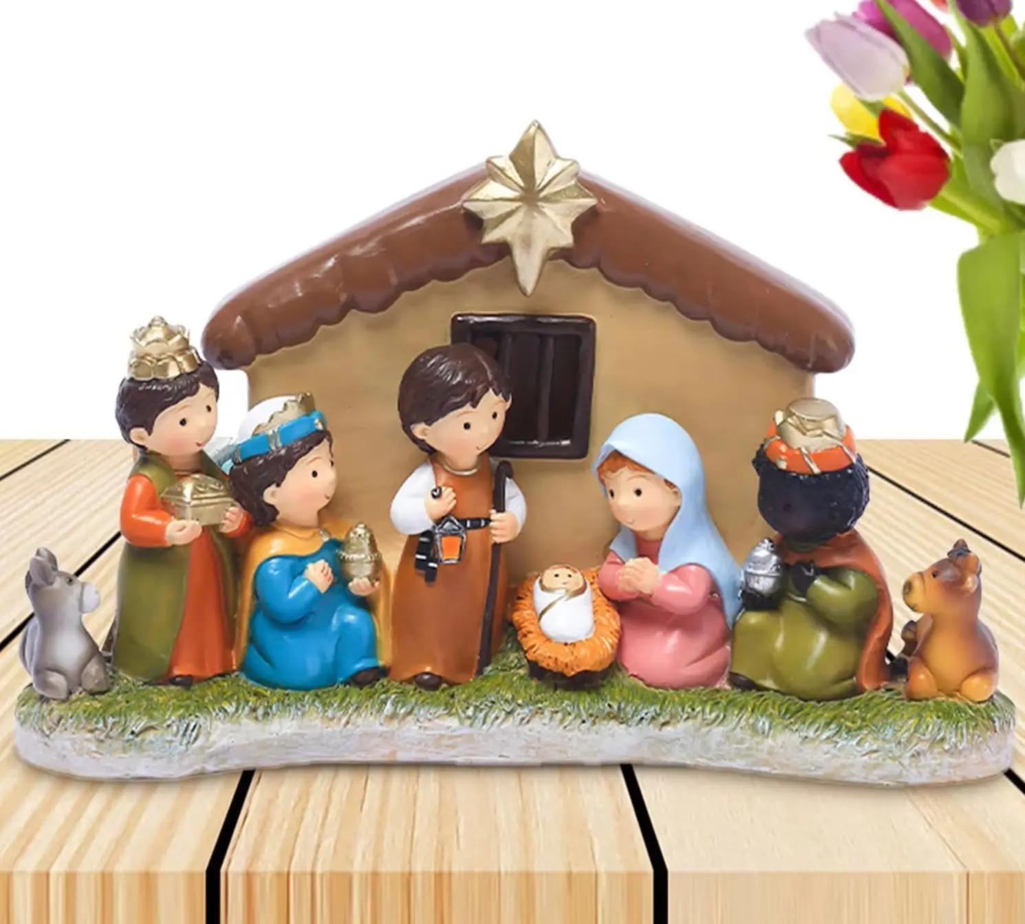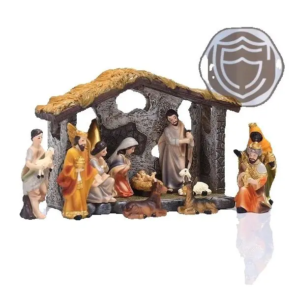 Set di presepe di mangiatoia di Natale Statue di presepe da tavolo Ornamento 12 pezzi Figurine di presepe in resina Figurina di presepe festosa