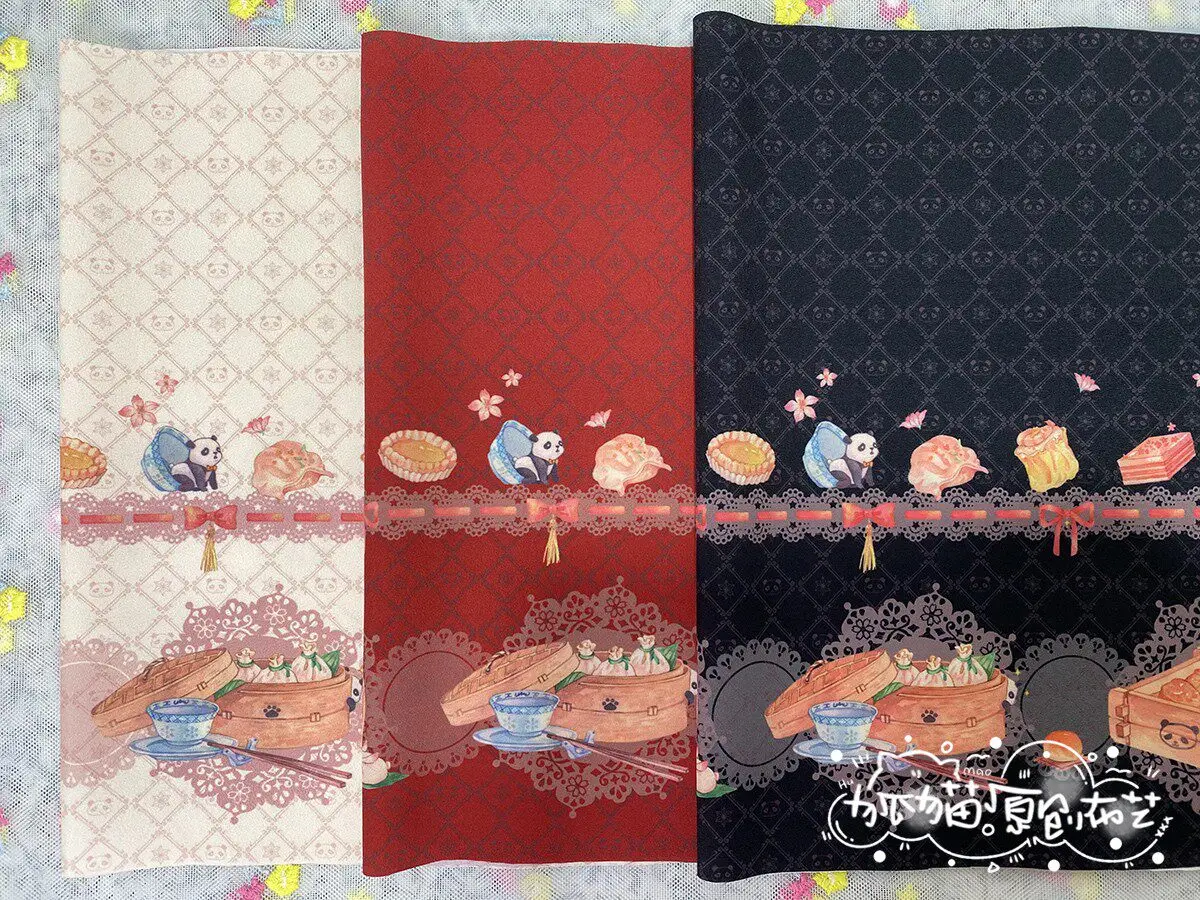Tessuto stampato "Panda e tè mattutino" in stile cinese - Per vestiti per bambole BJD, giocattoli di peluche fatti a mano e abbigliamento per animali domestici fai da te 24x145 cm