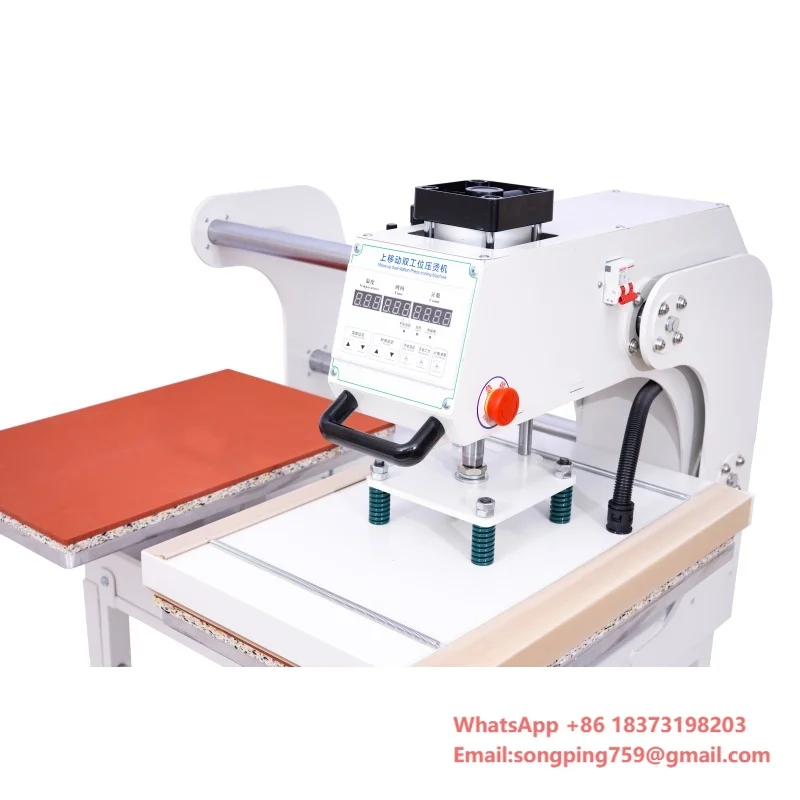 Pressa di calore pneumatica a doppia stazione per la stampa di abbigliamento e indumenti, disponibile in taglie 10 * 10 cm e 40 * 40 cm.