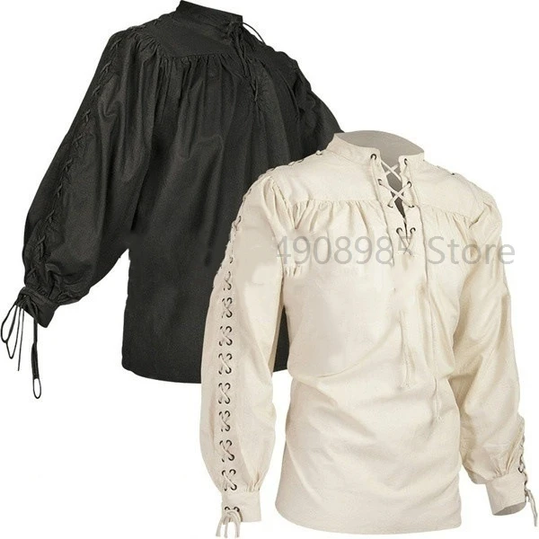 Camicie medievali da uomo Tunica Costume da pirata Abiti gotici Camicia vintage da uomo Scollo con volant Coulisse Cavaliere Cosplay Halloween