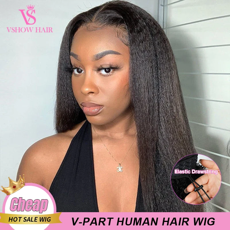 VSHOW Parrucca crespa diritta EasiContour con parte a V Capelli umani al 100% con coulisse invisibile Parrucca con parte a V aggiornata senza colla