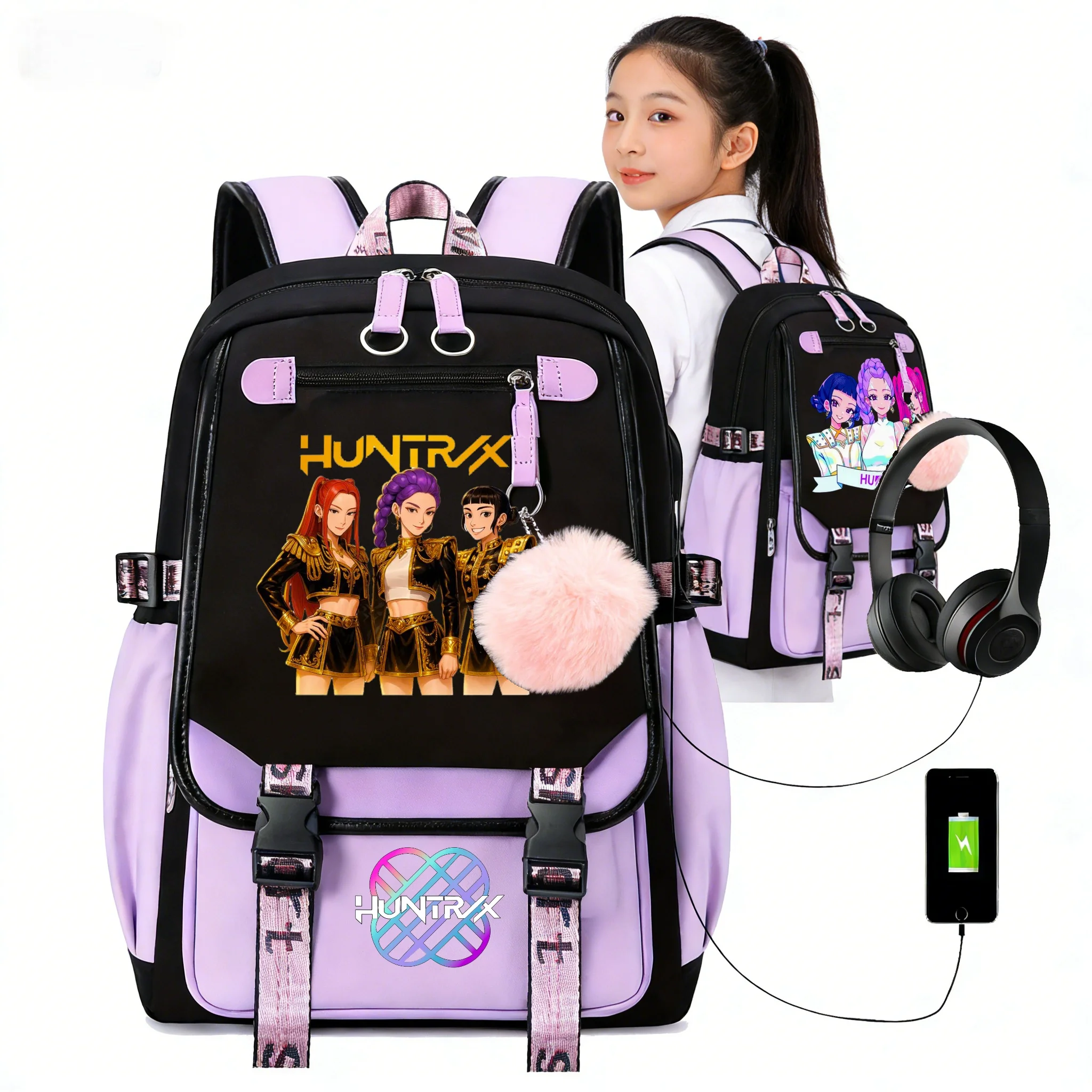 Zaino KPop Demon Hunters Capacità USB Donna Rumi Mira Zoey HUNTR/X Saja Ragazzi Borse da scuola patchwork YK2