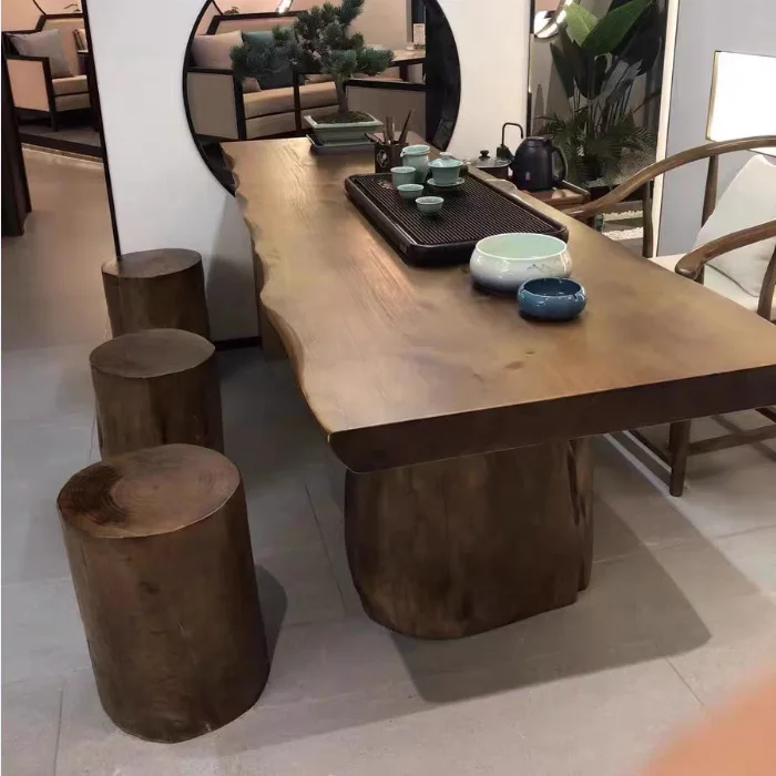 Massief houten grote bordtafel, log theetafel, eenvoudig bureau, wabi-sabi kantoor