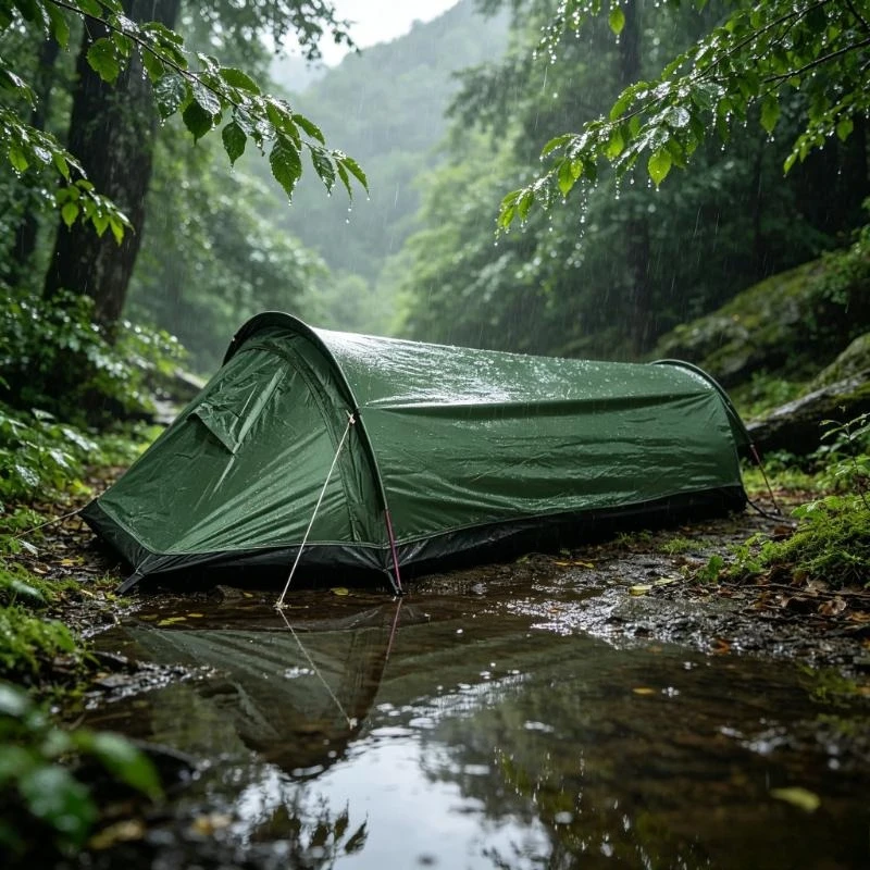 Ultralichte, waterbestendige, draagbare campingtent voor één persoon met aluminium frame en slaapzak.
