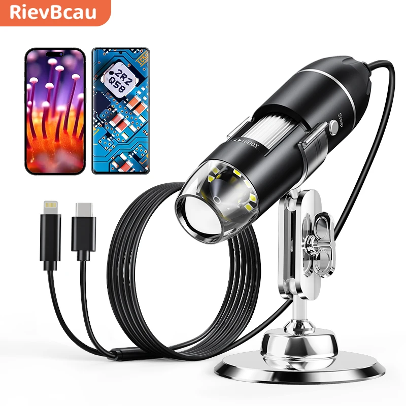 RIEVBCAU USB-microscoop 1600X vergroting met 8 LED's digitale spiegescope Compatibel met iOS en Android 1920P-muntmicroscoop