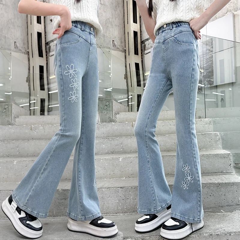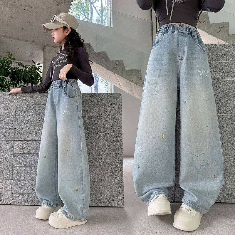 Meisjes losse wijde pijpen jeans zachte broek kinderen strik borduurwerk rechte denim broek lente herfst kleding 5-12 jaar