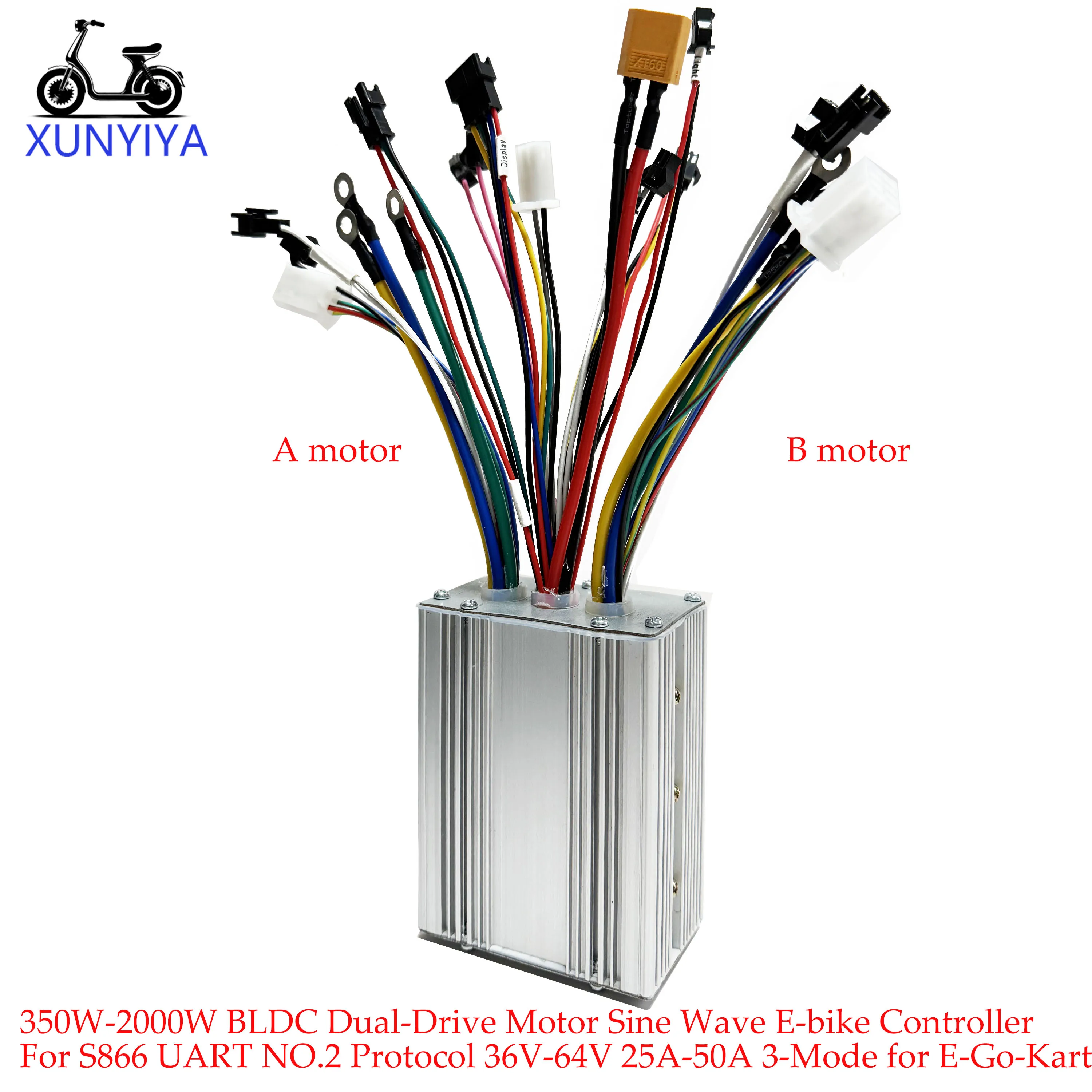 Sinusvormige Dual Drive Borstelloze Motorcontroller voor S866 SW900 LCD Display 36-64V 25A-50A 350W-1000W voor Tweemotorige E-bike