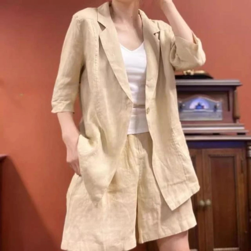 Minimalistische katoenen en linnen tweedelige set voor dames, effen kleur, jasje met enkele knoop + hoge taille short