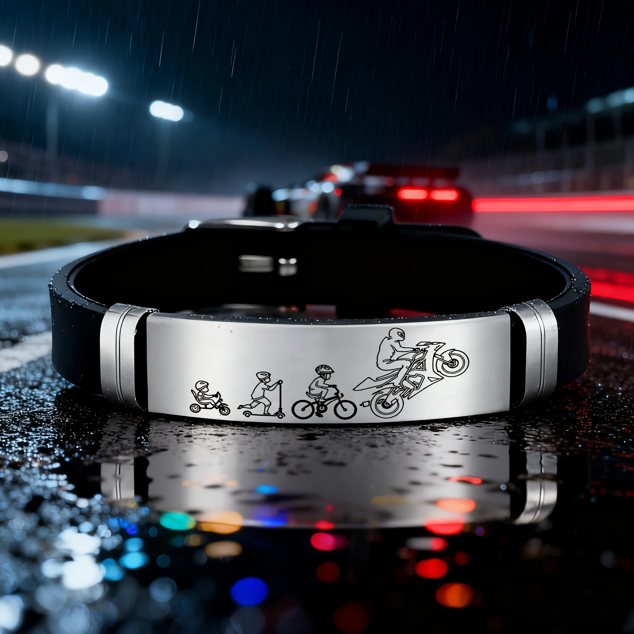 Heren motorfiets evolutie silhouet patroon accessoire, roestvrijstalen siliconen armband, cadeau voor motorliefhebbers