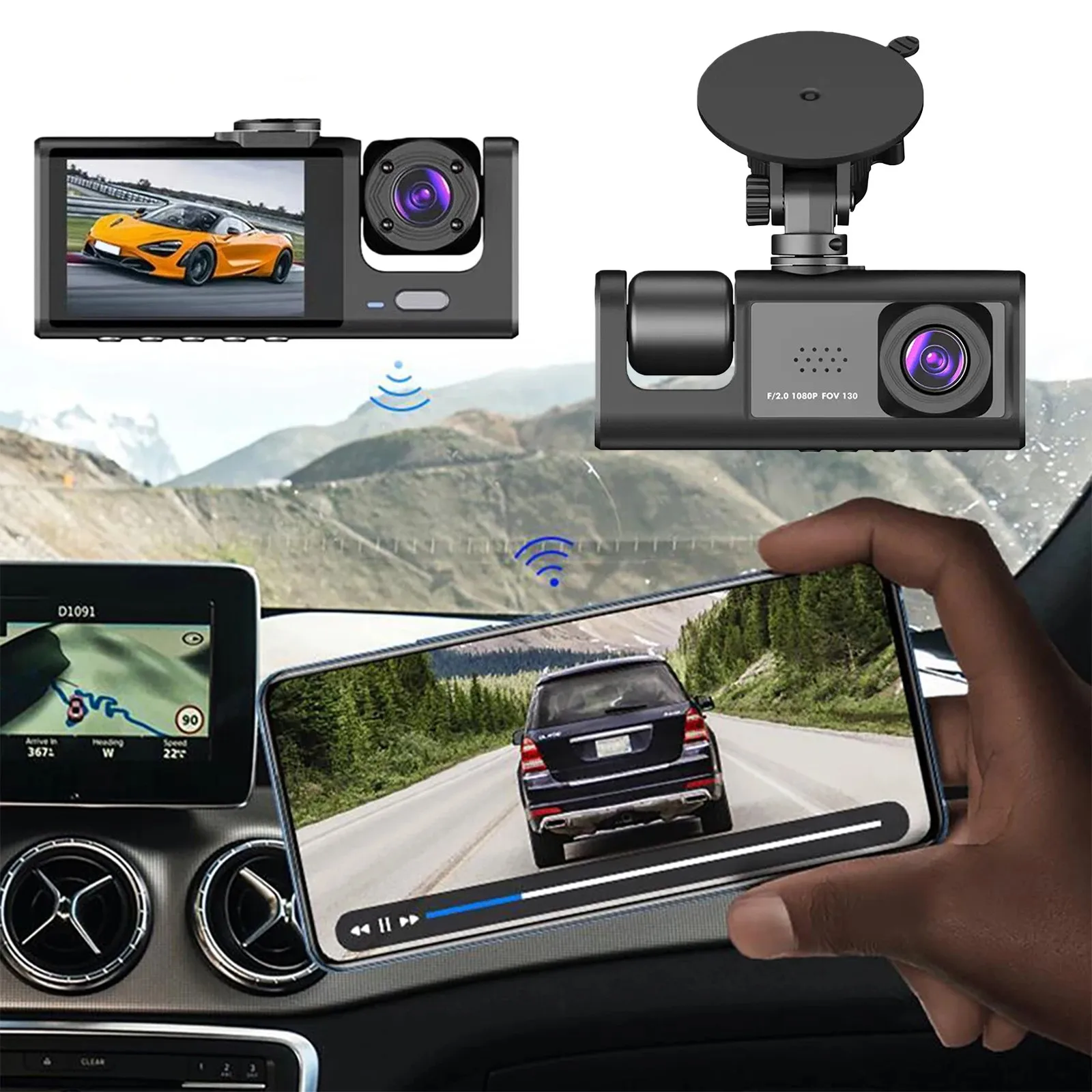 3-camera dashcam voor auto, 1080P video recorder, WIFI auto DVR, 2-lens voor- en achteruitrijcamera, nachtzicht, auto-accessoires