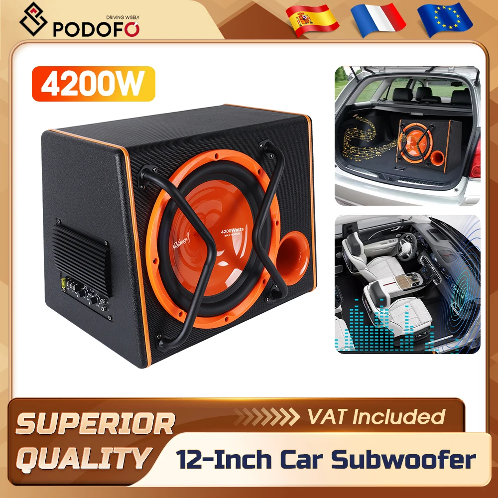 Podofo 12 inch 4200W krachtige bandpass auto subwoofer behuizing met audiokabel, diepe bas stereoluidspreker voor auto audiosysteem
