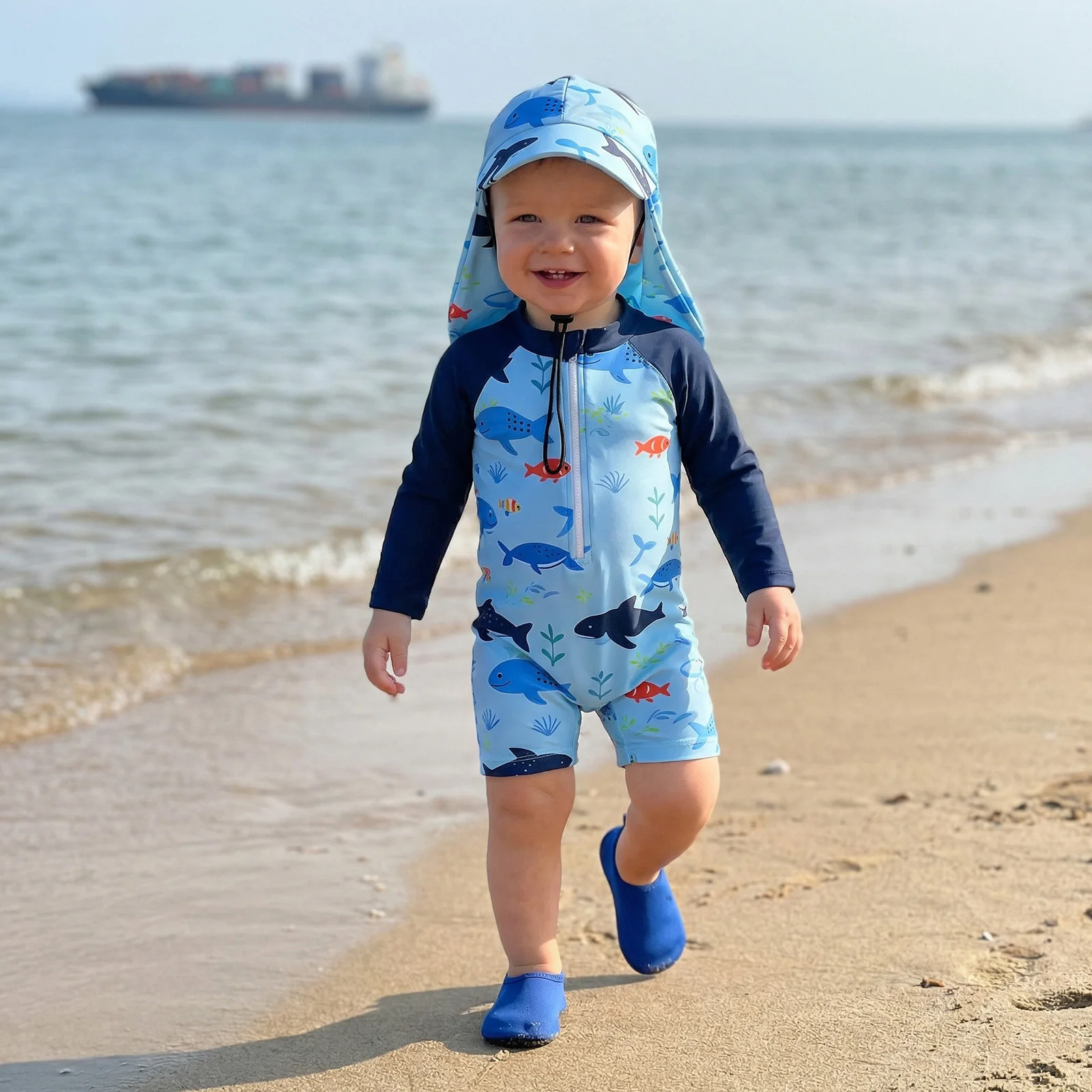 Peuter Baby Jongens Rash Guard Badpak Romper Marine Print Lange mouw Mock Neck Rits Badkleding met hoed 2-delige set