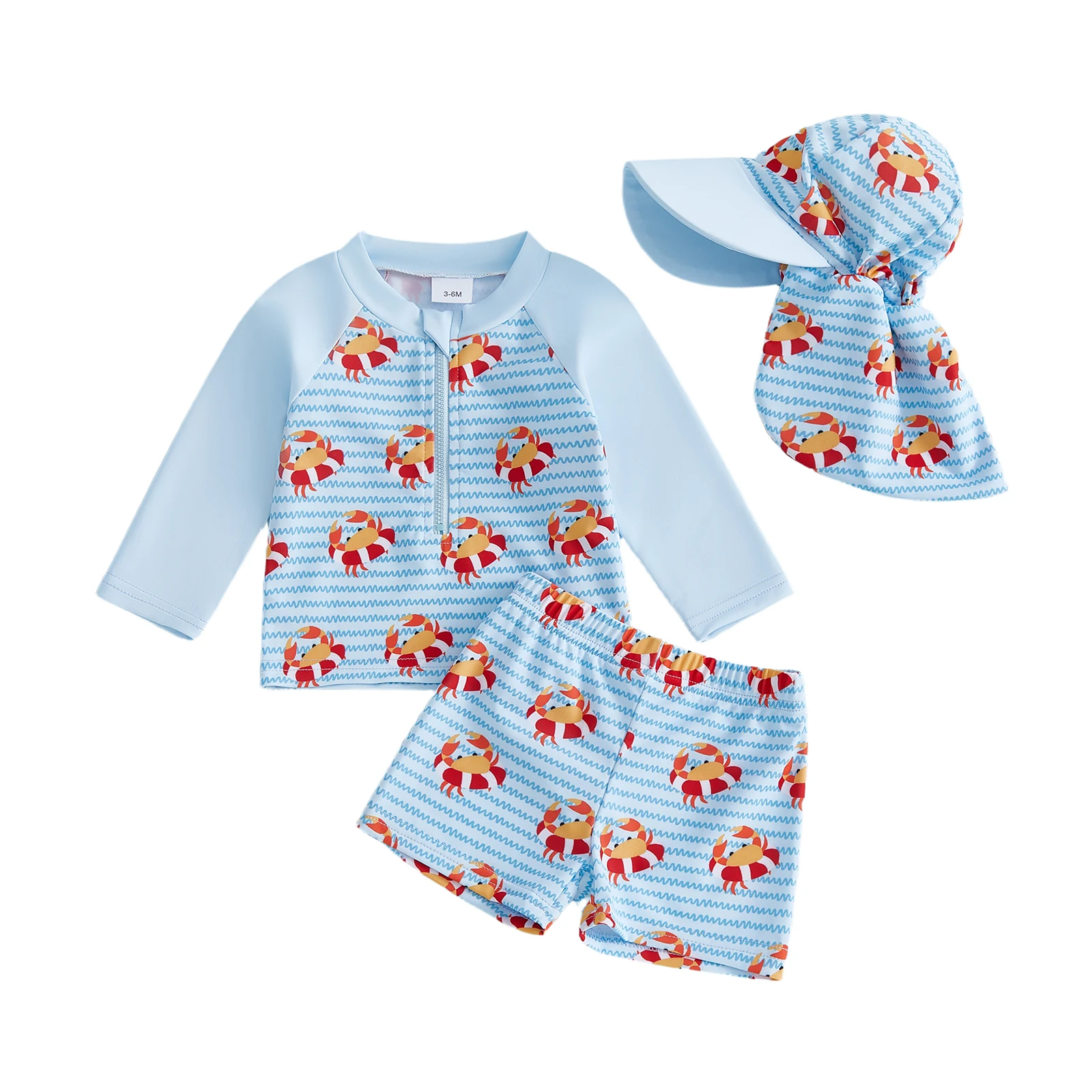 Rashguardset voor jongens, 3-delig snel drogend zwempak, krabprint, lange mouwen, zwembroek, zonnepet, badpak 0-5 jaar