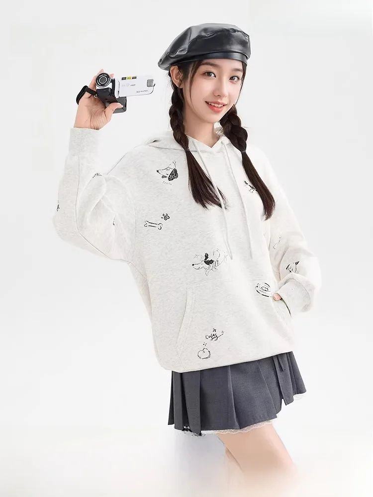 Loose Fit Hoodie Sweatshirt Dachund Print Eenvoudig ontwerp Winter Nieuwe collectie Dames Faion Katoenmix Long Sve Crew Ne