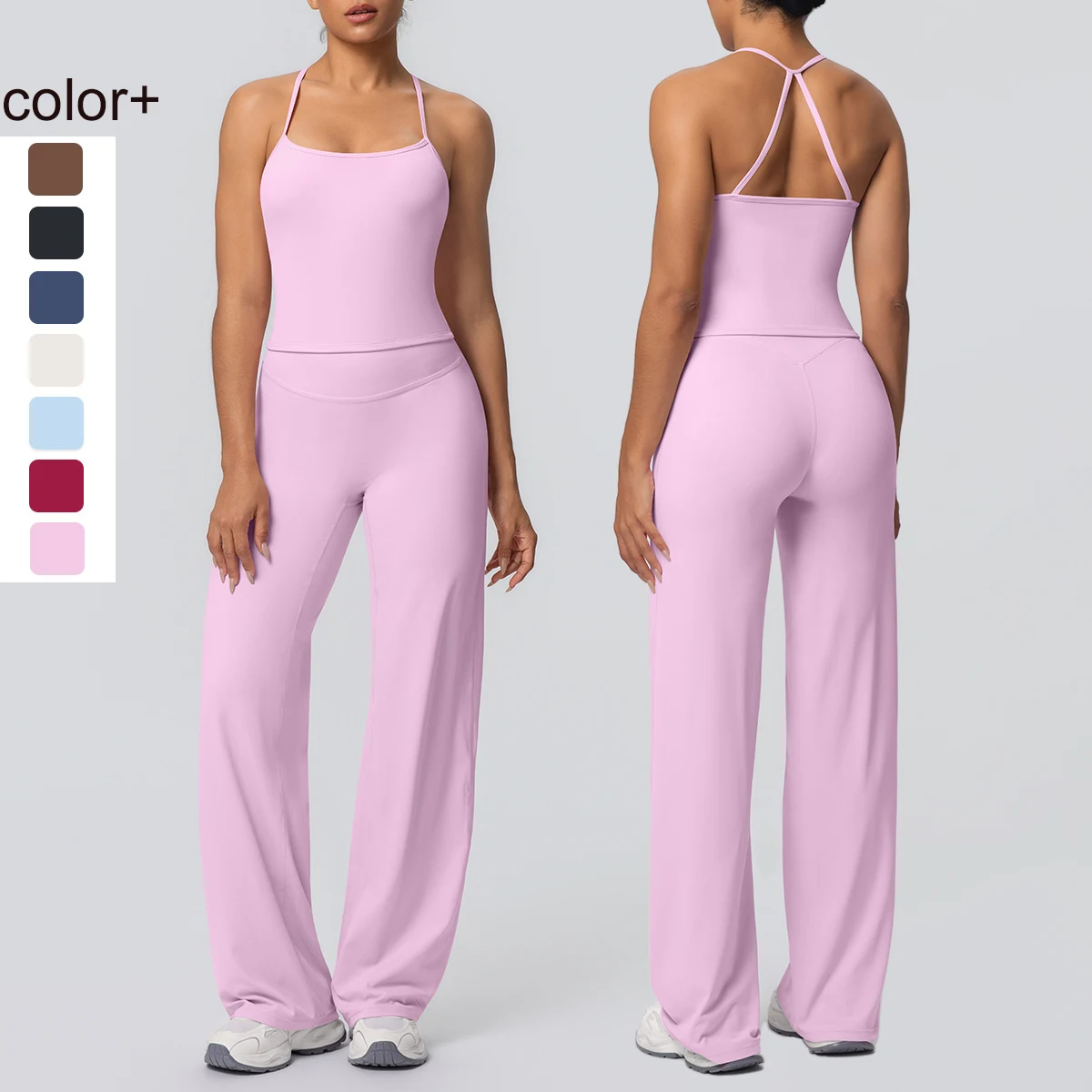 2 stuks effen kleur gym sport yoga set voor vrouwen sexy mooie rugband vest workout top ademende wijde pijpen broek yoga pak