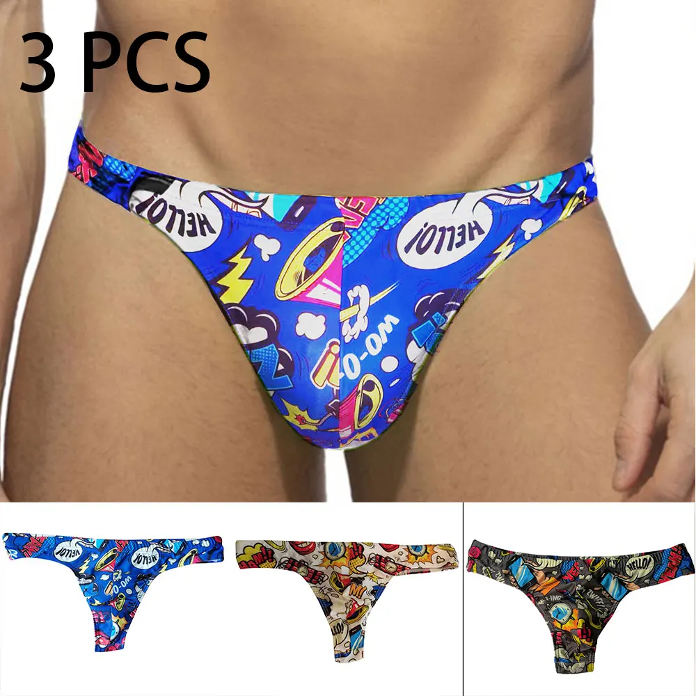 3 stks heren Pop Art Cartoon Print Laagbouw Sexy Bikini Thong Badmode Strand Zwemslips Mini Badpak Zwembroek Badpak