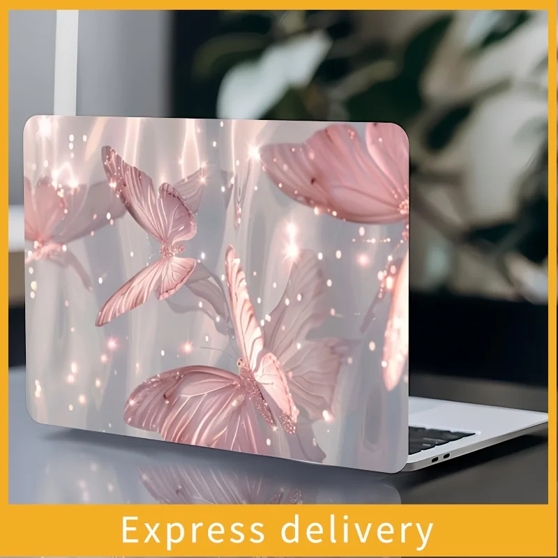 Set van twee roze vlinder-laptopstickers in een lichtbeige kleur. Deze zelfklevende kunststickers zijn krasbestendig en duurzaam.