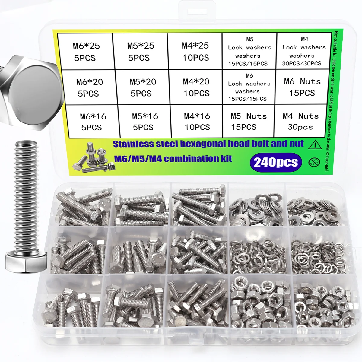 240-delige combinatieset van roestvrijstalen zeskantbouten, moeren en ringen, M4/M5/M6 zeskantbouten, geschikt voor reparatie thuis en bij machines.
