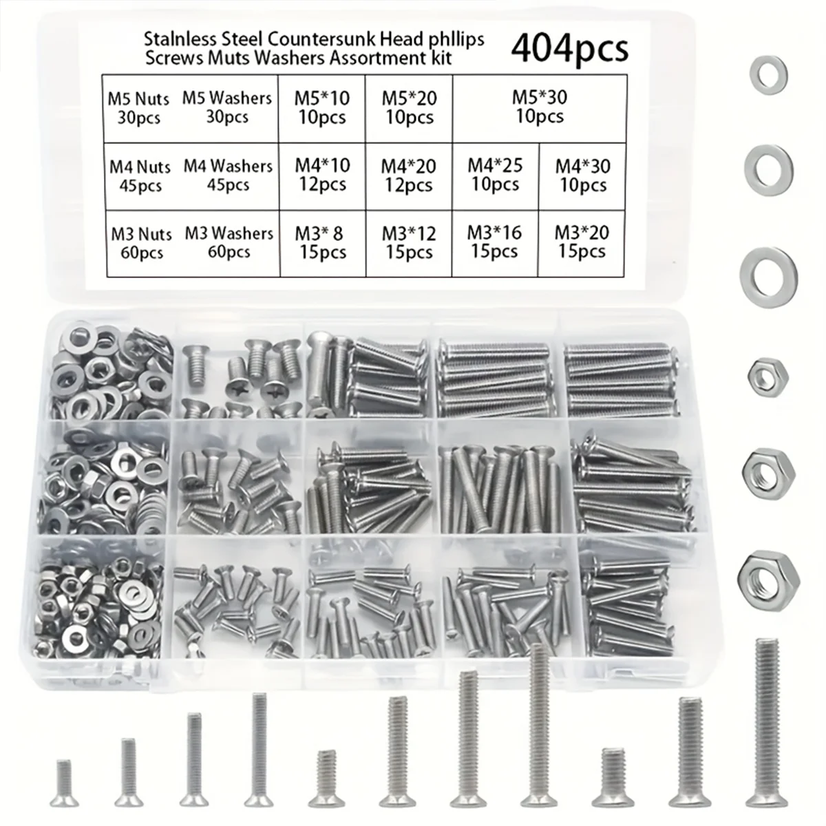 404-delige set roestvrijstalen Phillips verzinkte kopschroeven en moeren, M3 M4 M5 verzinkte kopschroeven, doe-het-zelf schroeven en moeren gereedschapsset