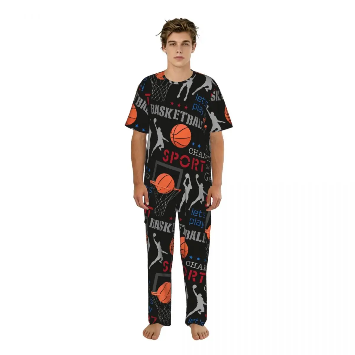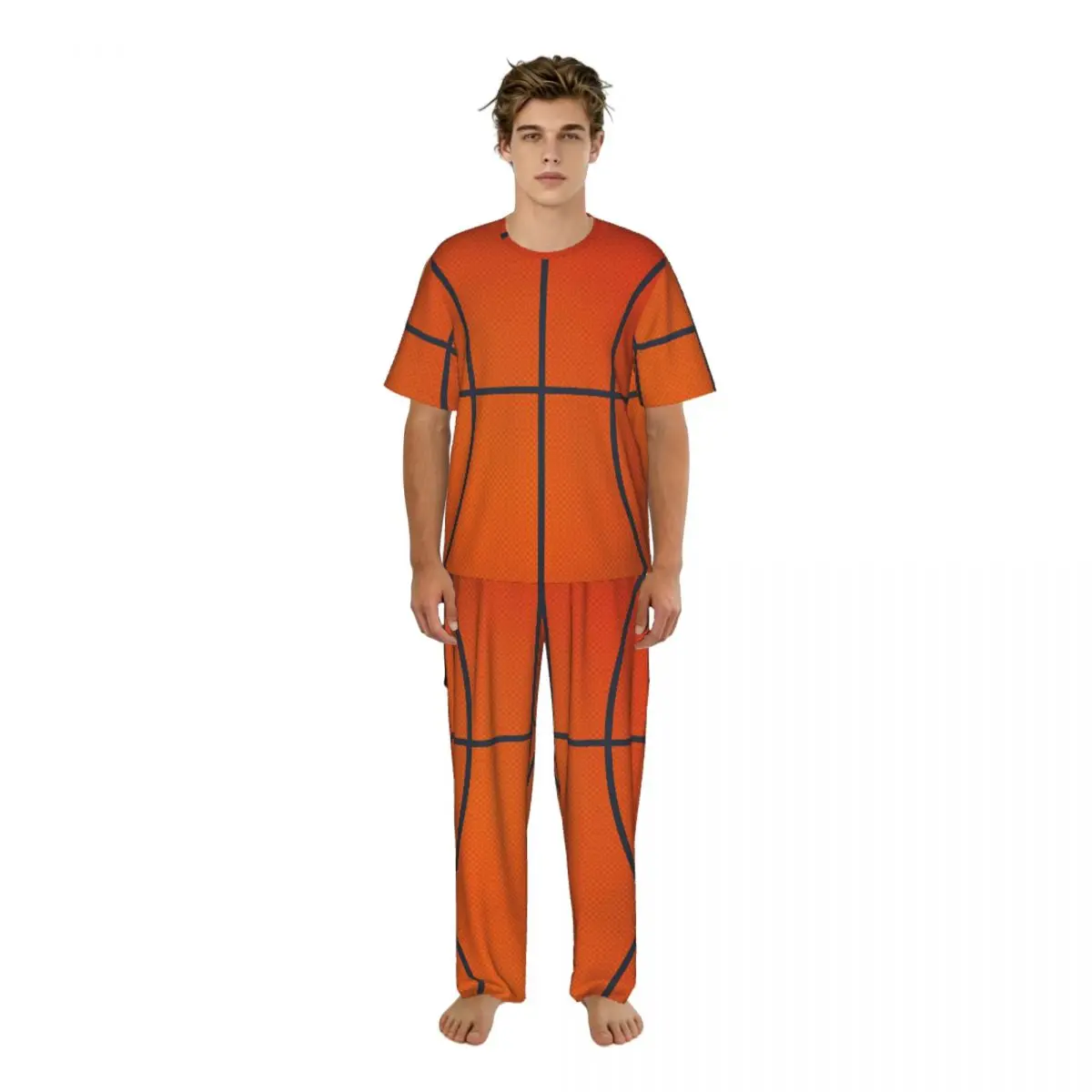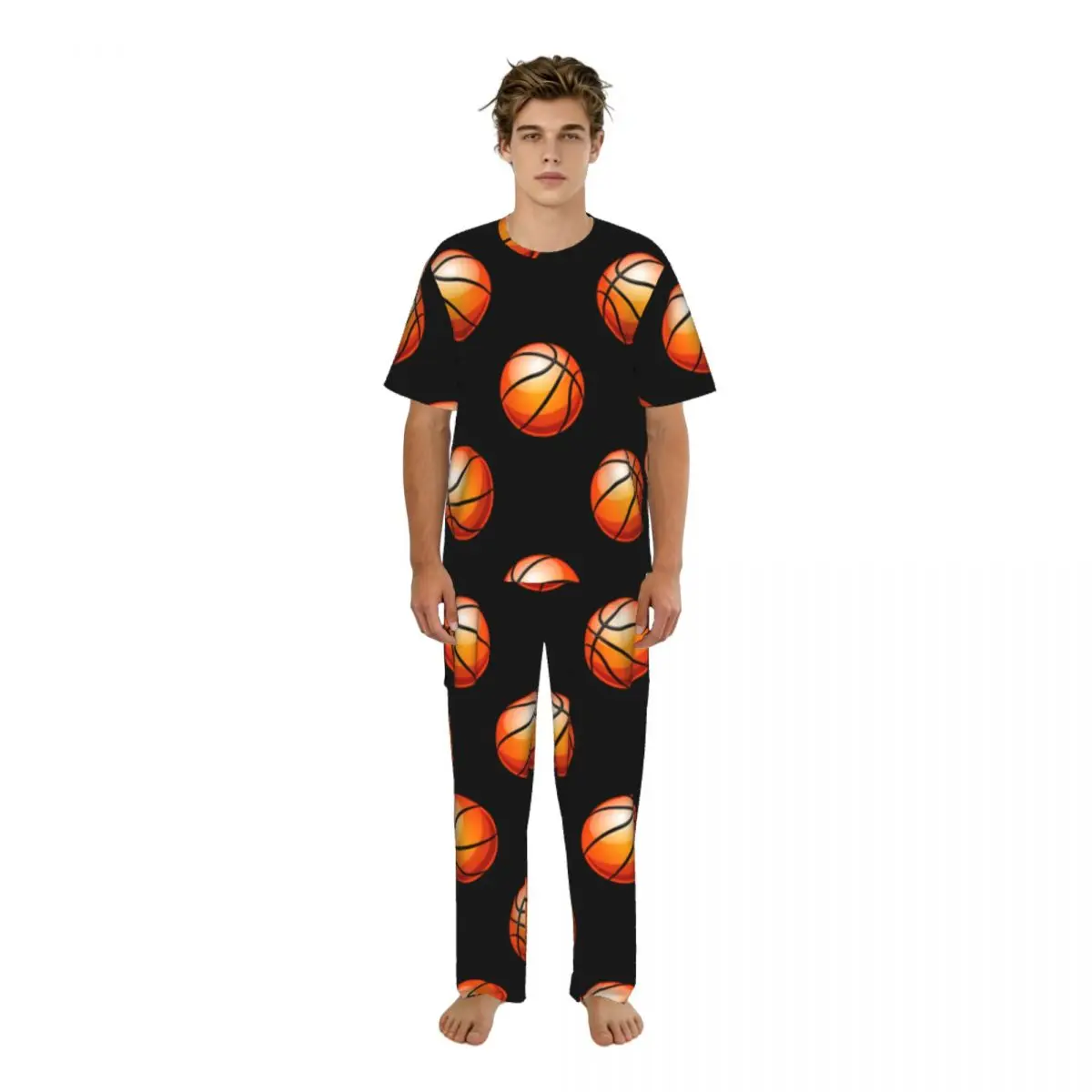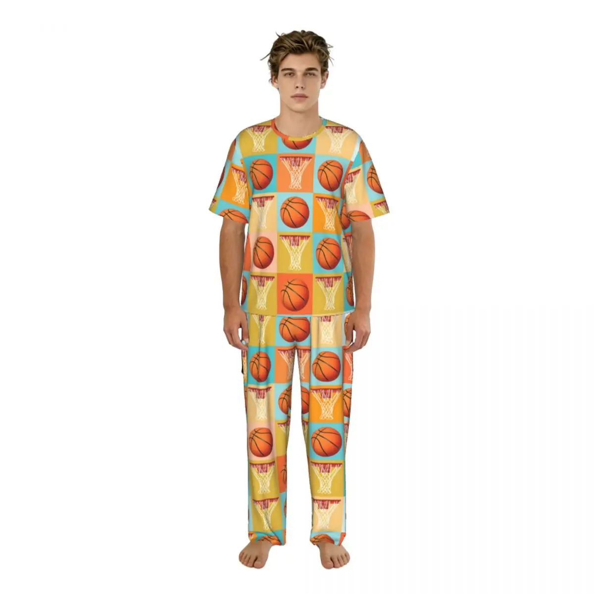 Heren pyjamapak met korte mouwen en lange broek, basketbalachtergrond, nachtkleding, zomerkledingset voor thuis