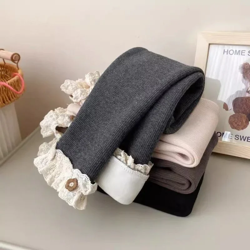 Kinderkleding Meisjes Meisjes Fleece gevoerde legging Winter Warm Ruche Trim Stretchy Peuter Zoete Koreaanse stijl broek