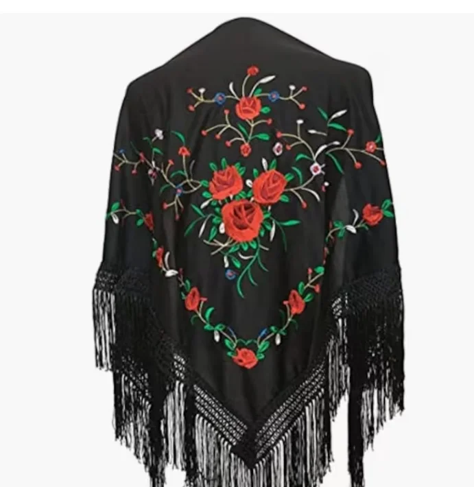 Flamenco Of Sevillanas (150X70cm) Zwart Geborduurd Rood/Groen Medium Driehoekige Piek Sjaal...
