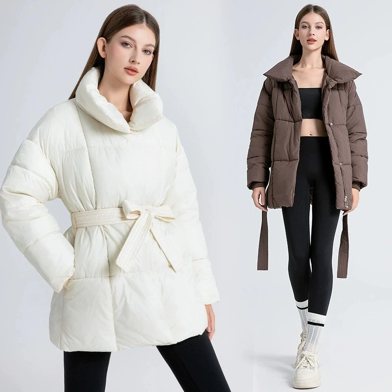 Halflang tot lang katoenen winterjas, nieuwe modecollectie 2025, afslankende katoenen jas met taille, opstaande kraag, dik en warm katoen