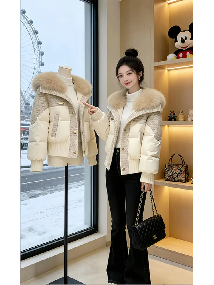 Modieuze patchwork-jas van verdikt katoen voor dames, winter, nieuwe stijl, casual woon-werkjas met grote bontkraag