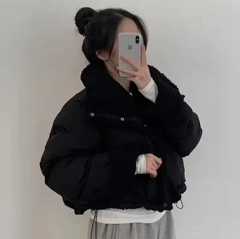Dubbelzijdig Slijtage Vrouwen Katoenen Gewatteerde Jas 2023 Nieuwe Herfst Winter Chic Harige Patchwork Korte Parka Vrouwelijke Warme Uitloper
