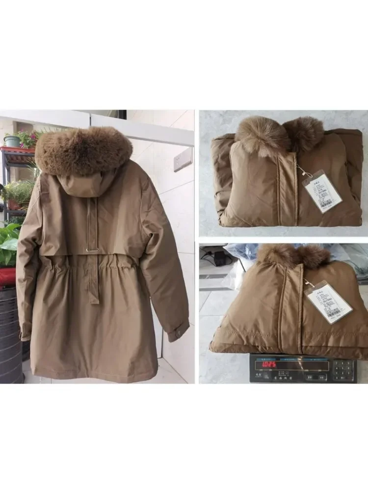 2025 Nieuwe Winter Vrouwen Parka Blauwe Lange Jas Wollen Voering Capuchon Parka Slanke met Bontkraag Warme Sneeuw Slijtage Gewatteerde kleding
