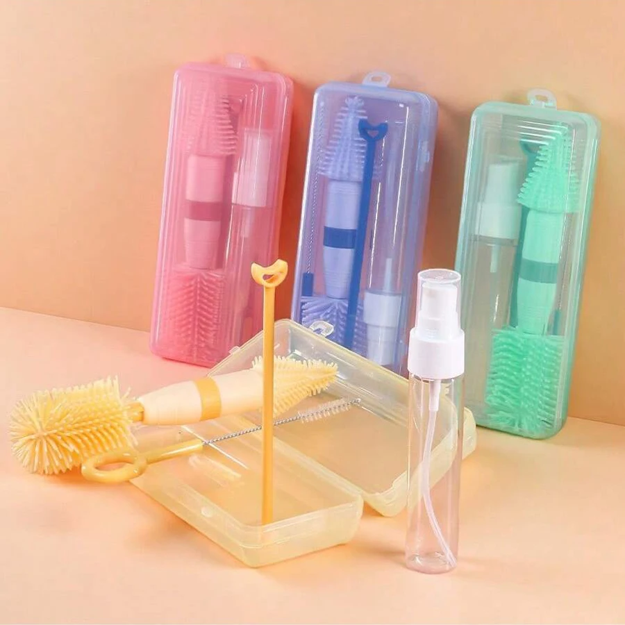 Draagbare 6-in-1 babyflesreiniger set met droogrek, 2 siliconen babyflesborstels, rietjesborstel, speenborstel & opbergdoos
