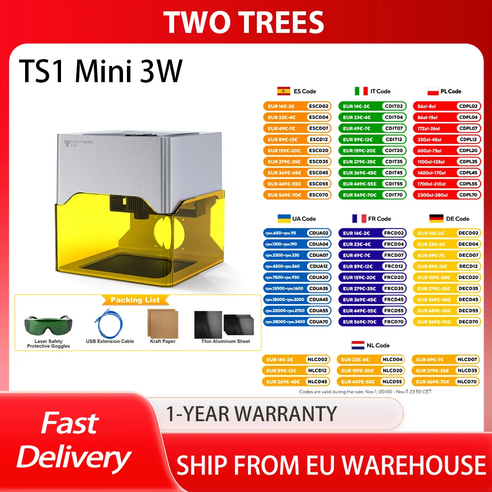 TWEE BOMEN TS1 Mini 3W lasergraveerder, 800 mm/min snelheid, 0,01 mm precisie, ondersteunt objecthoogte 0-35 mm, compatibel met Lightburn