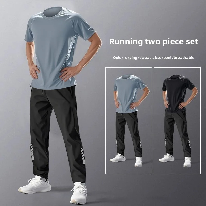 Fitnesskleding heren zomer ijszijde korte mouwen sneldrogend pakset, professionele hardloopsporttrainingstop, broek