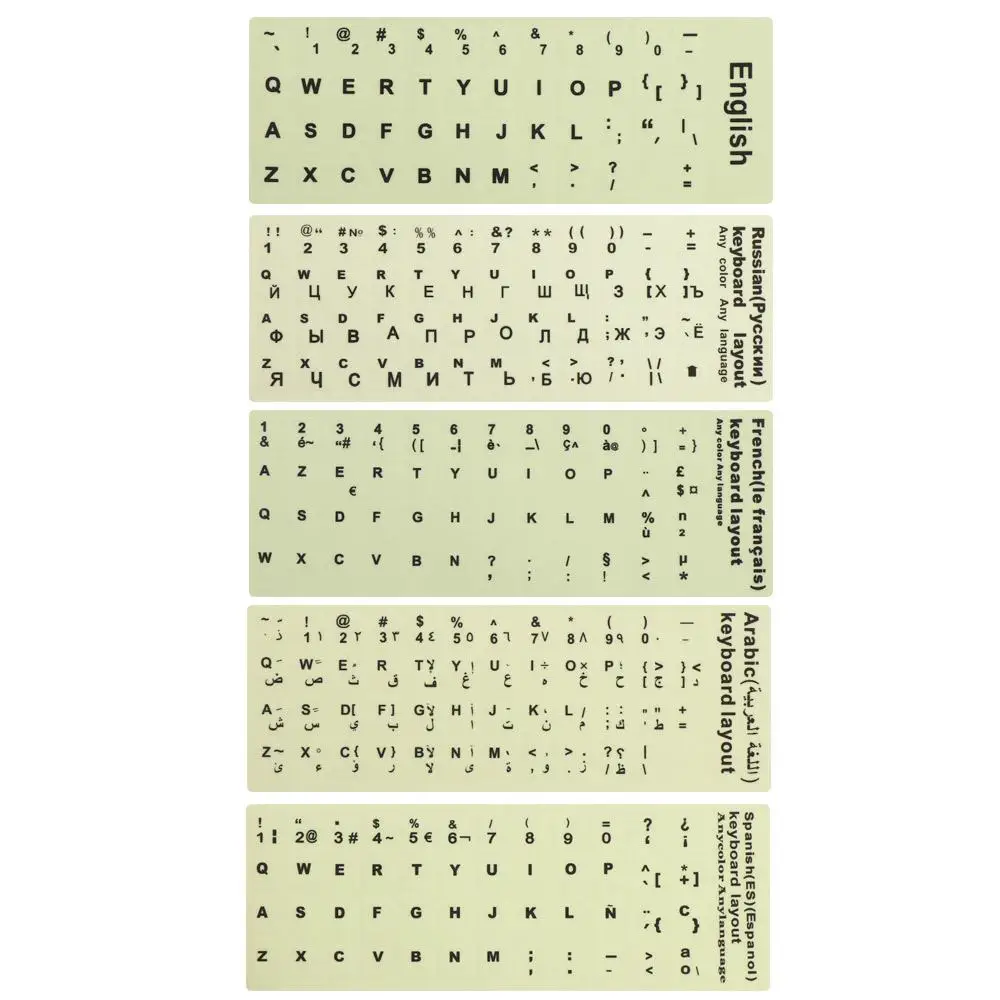 Lichtgevende Toetsenbordstickers Spaans/Engels/Russisch/Arabisch/Franse Taal Letter Beschermende Film Alfabet Knop Lay-Out