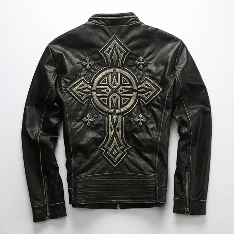 Nieuwe herfst leren herenjas, geborduurd en geborduurd, slank kort rundleer jack, herenmotorjas