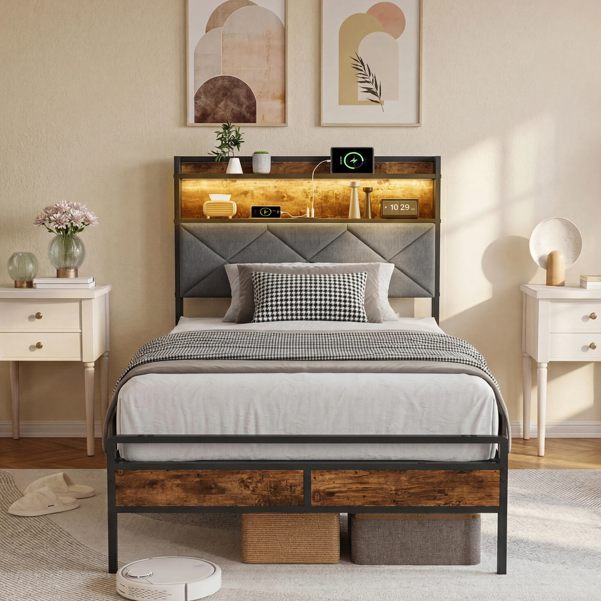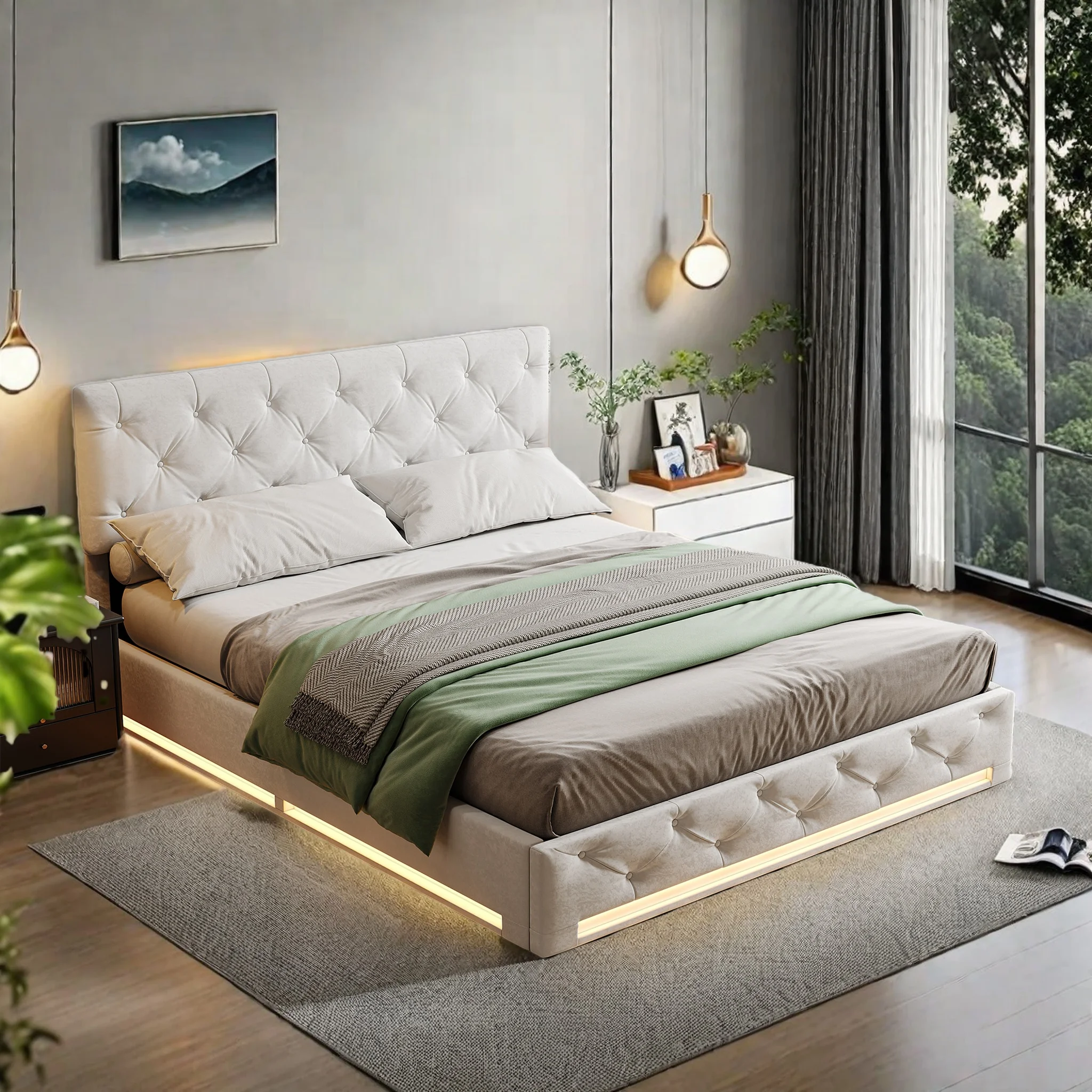 Comanlai Grey Linen Gasveer Opbergbed met LED-lichtstrip en stopcontact, 140x200/160x200cm (matras niet inbegrepen)
