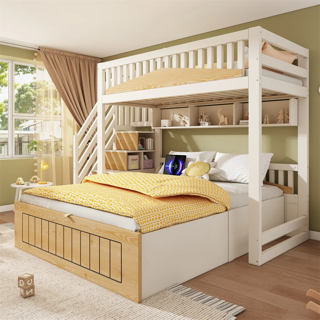 Kinderdubbelbed, houten bedframe, tweepersoonsbed, 90x200 en 140x200 centimeter, familiebed, zonder matras