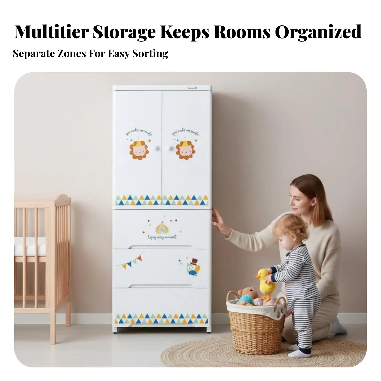 Kinderkast op wielen met afgeronde hoeken, opbergkast met schattig dierenontwerp, afsluitbare bovenste lade voor kinderen en baby's