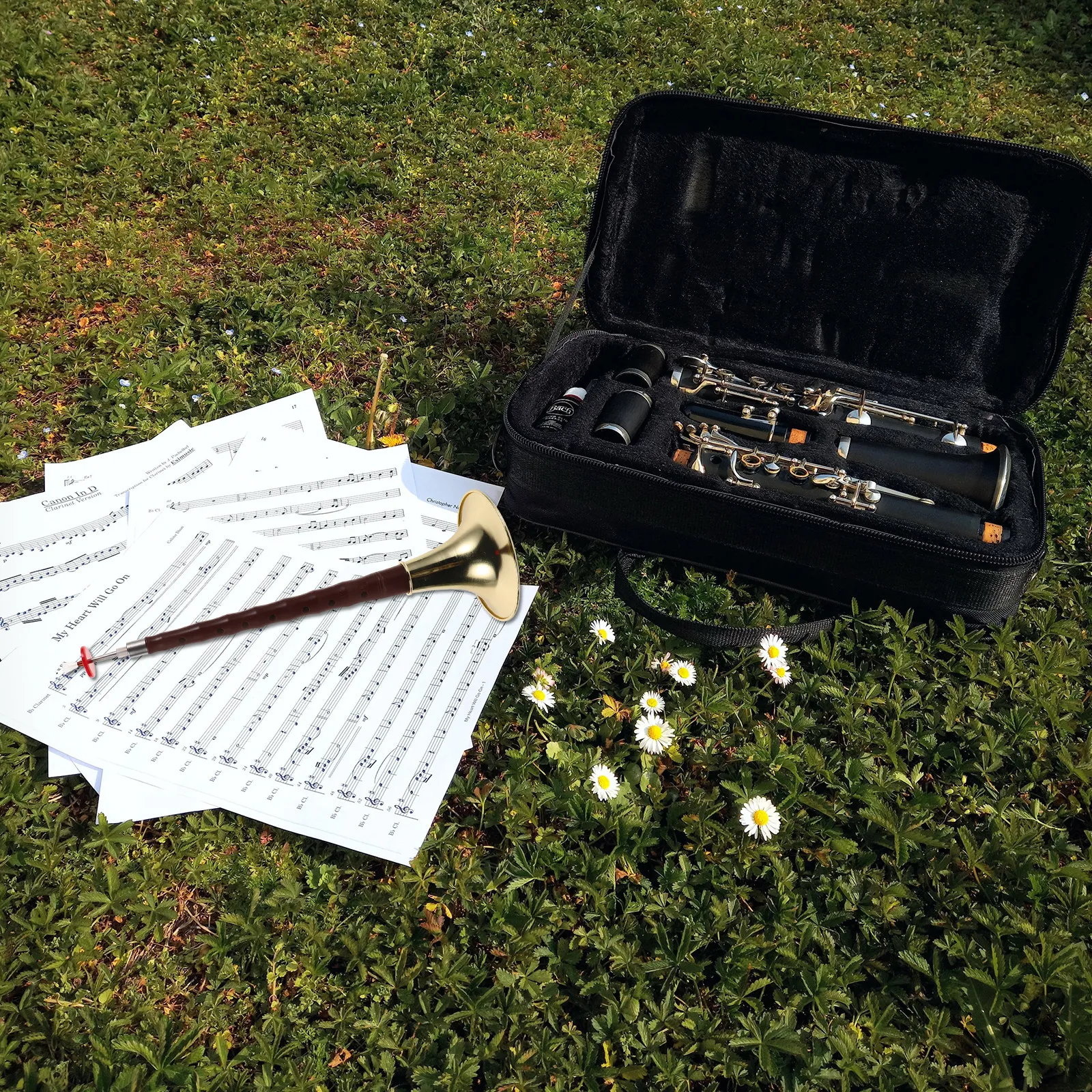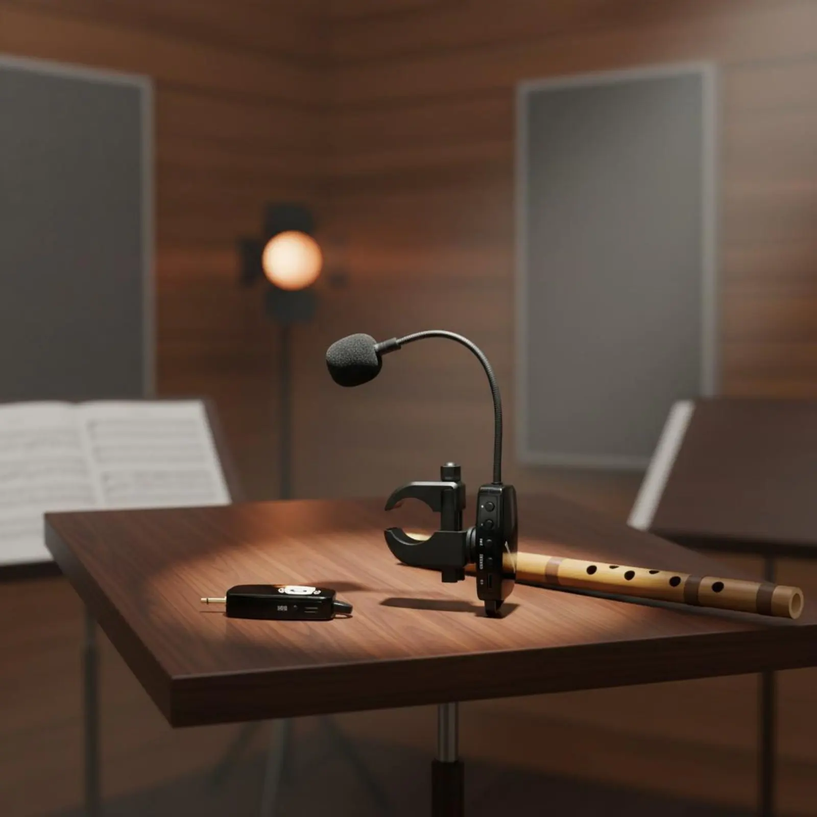 Draadloze fluit-audio-opnamesysteem met langdurige batterij en verlengde levensduur, opzetbaar voor blaasinstrumenten.