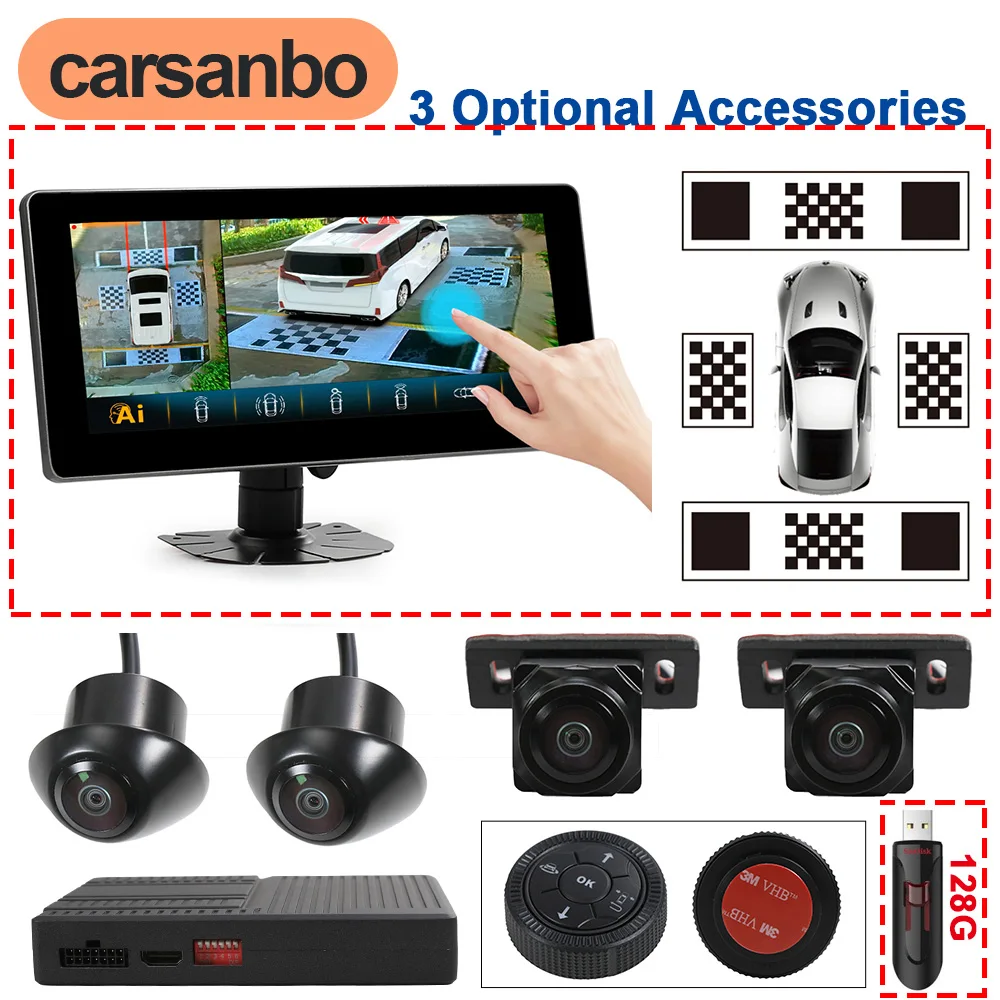 Carsanbo AHD 1080P 360 graden 3D surround view-systeem met vogelogen View DVR-recorder AI Intelligente herkenning 360 autocamera