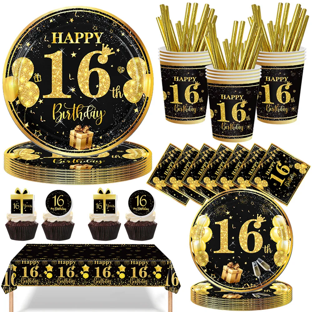 Gelukkige 16e verjaardag decoraties 16 jaar oude verjaardagsfeestje servies borden servetten zwart goud 16e verjaardag feestartikelen