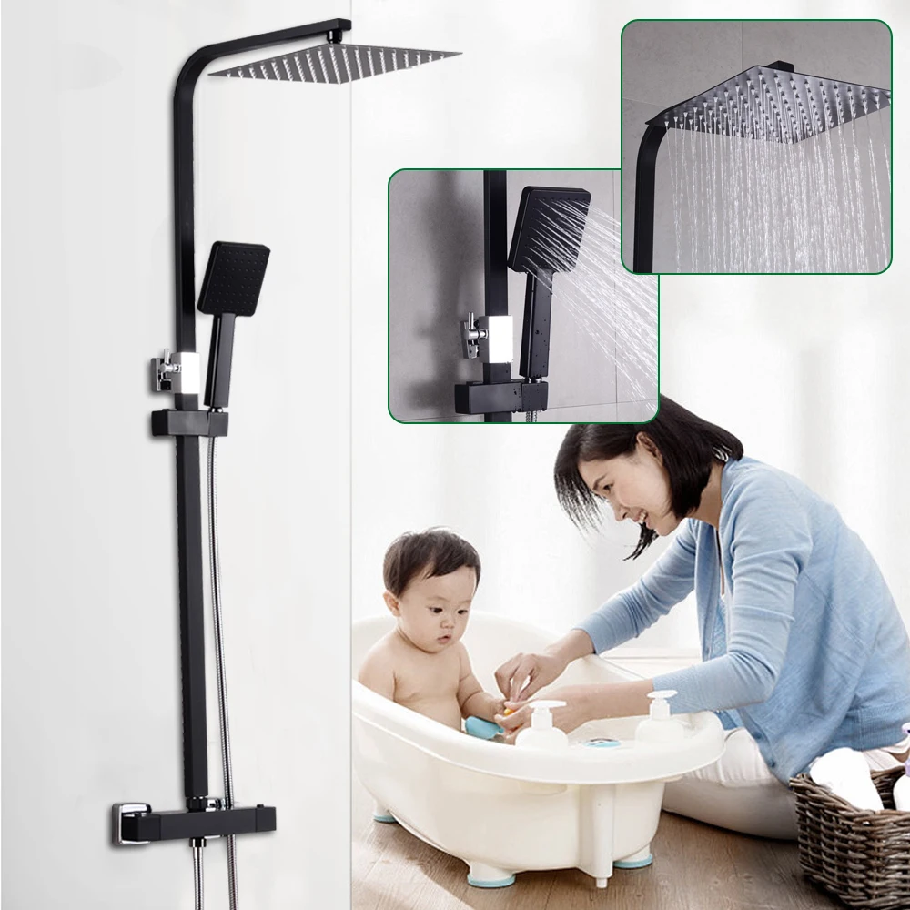 Doucheset met warm en koud water, zwarte thermostaat doucheset, boven- en handdouche