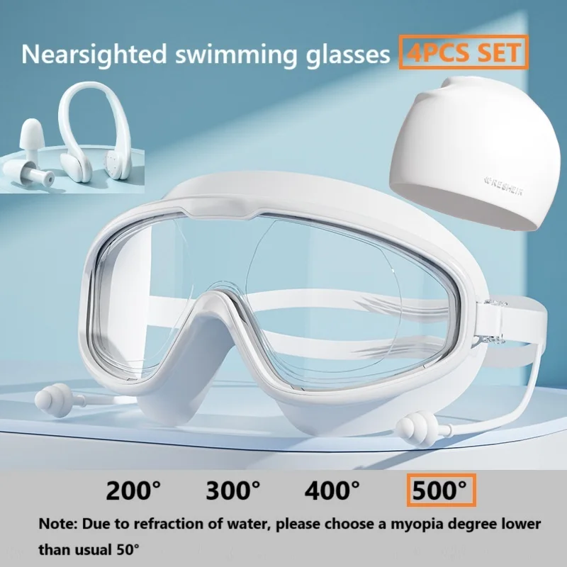 4-delige set bijziendheid zwembril voor volwassenen, groot frame HD waterdichte anti-condens modieuze uitrusting inclusief bijziendheid zwembril
