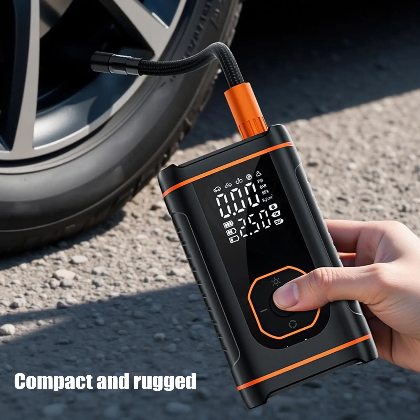 Draagbare draadloze pomp met slim digitaal display, automatische stop, snelladen en zaklamp voor auto, fiets, motorfiets.
